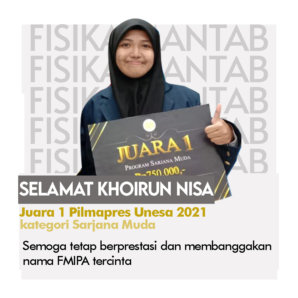 Khoirun Nisa’ (red: Nisa’), Mahasiswa Jurusan Fisika Unesa berhasil menjadi Juara 1 Pilmapres Unesa 2021